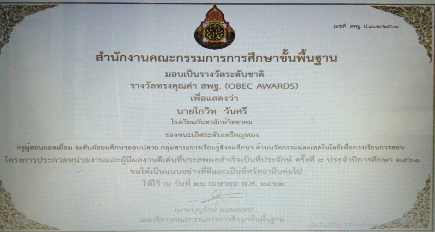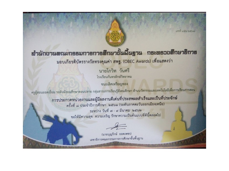 รางวัลรองชนะเลิศ เหรียญทอง OBEC AWARDS ระดับชาติ. ปี 2561