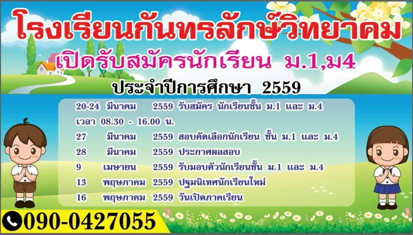 รับสมัครนักเรียนใหม่ ณ.ห้องกองทุนกิจเจริญไทย 20-24 มีนาคม 2559 เวลา 08.30 น.-26.00 น. โทร.0900427055
