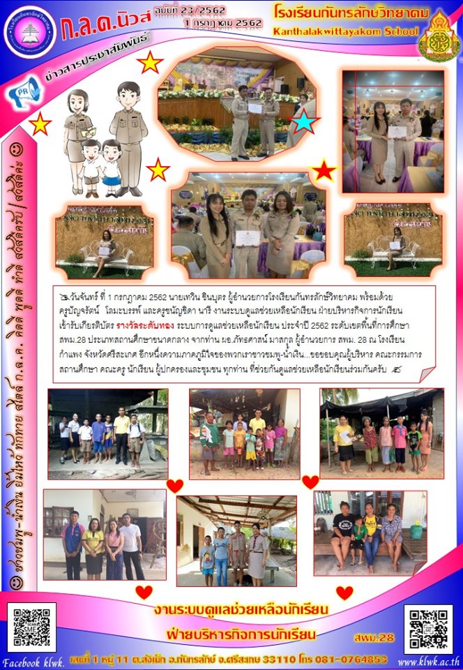 วันจันทร์ ที่ 1 กรกฎาคม 2562 นายเทวิน ชินบุตร ผู้อำนวยการโรงเรียนกันทรลักษ์วิทยาคม พร้อมด้วยครูปัญจรัตน์ โลมะบรรพ์ และครูชนัญชิดา นารี งานระบบดูแลช่วยเหลือนักเรียน ฝ่ายบริหารกิจการนักเรียน เข้ารับเกียรติบัตร รางวัลระดับทอง งานระบบการดูแลช่วยเหลือนักเรียน ประจำปี 2562 ระดับเขตพื้นที่การศึกษา สพม.28 ประเภทสถานศึกษาขนาดกลาง จากท่าน ผอ.ภัทธศาสน์ มาสกุล ผู้อำนวยการ สพม. 28 ณ โรงเรียนกำแพง จังหวัดศรีสะเกศ อีกหนึ่งความภาคภูมิใจของพวกเราชาวชมพู-น้ำเงิน...ขอขอบคุณผู้บริหาร คณะกรรมการสถานศึกษา คณะครู นักเรียน ผู้ปกครองและชุมชน ทุกท่าน ที่ช่วยกันดูแลช่วยเหลือนักเรียนร่วมกันครับ