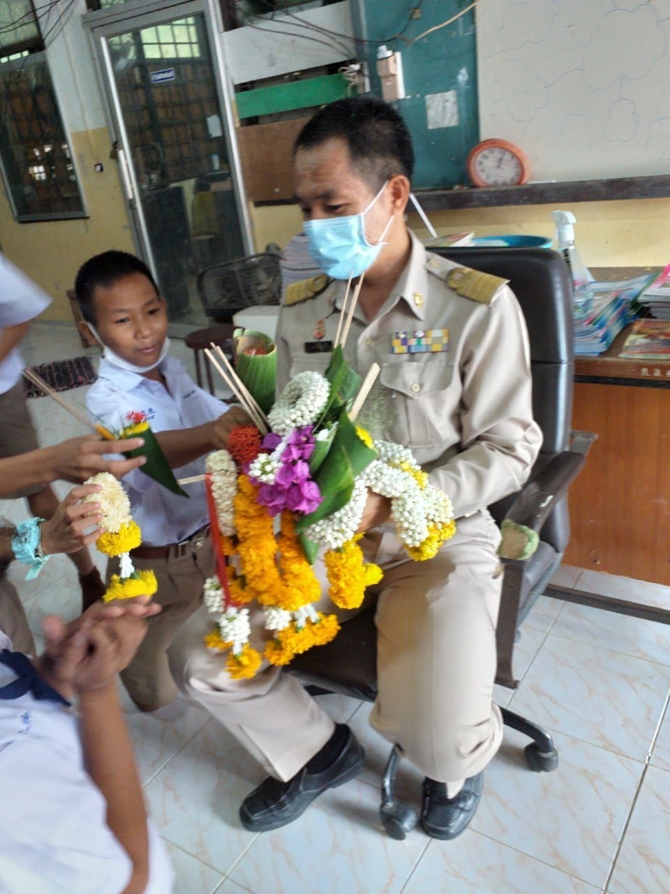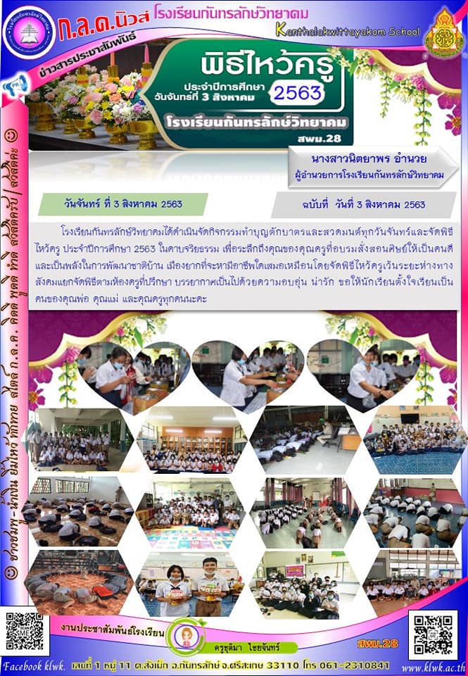 โรงเรียนกันทรลักษ์วิทยคม ได้ดำเนินการจัดกิจกรรมทำบุญตักบาตรและสวดมนต์ทุกวันจันทร์และจัดพิธีไหวัดรู ประจำการศึกษา 2563 ในดาบจริยธรม เพื่อระลึกถึงคุณของคุณครูที่อบรมสั่งสอนศิษย์ให้เป็นคนดี และเป็นพลังในการพัฒนาชาติบ้านเมือง ยากที่จะหาอาชีพใดเสมอเหมือน โดยจัดพิธีไหวัดรูเว้นระยะห่างทางสังคมแยกจัดพิธีตามห้องครูที่ปรึกษา บรรยากาศเป็นไปด้วยความอบอุ่น น่ารัก และขอให้นักเรียนตั้งใจเรียนเป็นคนของคุณพ่อ คุณแม่ และคุณครูทุกคนนะคะ |