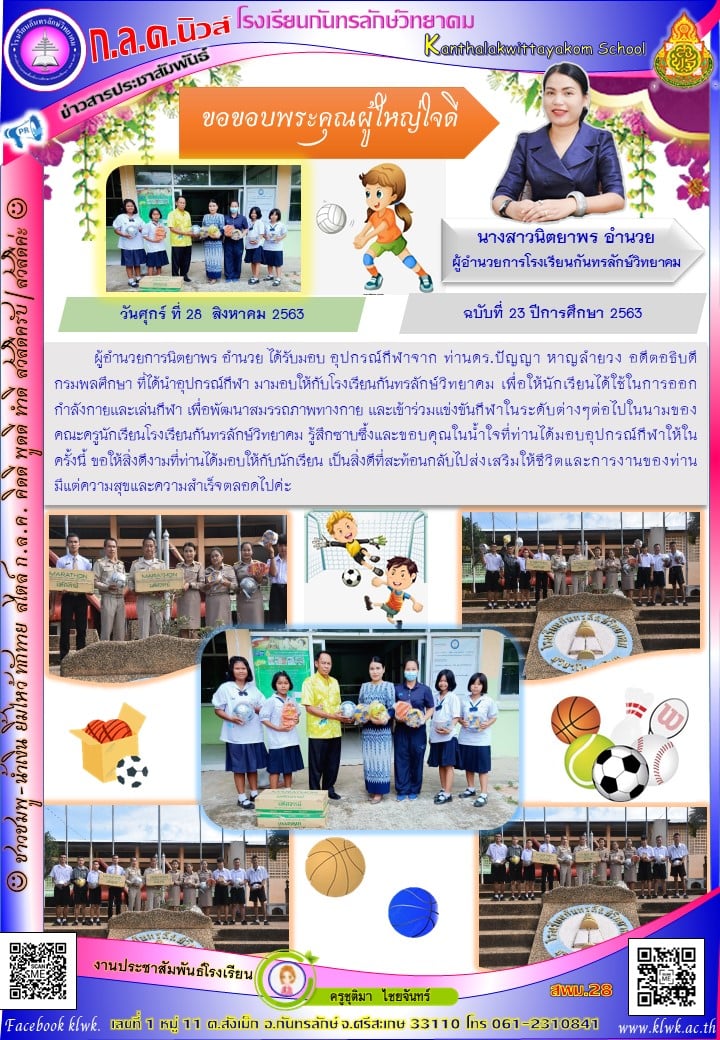 วันศุกร์ ที่ 28 สิงหาคม 2563 ผู้อำนวยการนิตยาพร อำนวย ได้รับมอบอุปกรณ์กีฬาจากท่านดร.ปัญญา หาญลำยวง อดีตอธิบดีกรมพลศึกษา ที่ได้นำอุปกรณ์กีฬามามอบให้กับโรงเรียนกันทรลักษ์วิทยาคม เพื่อให้นักเรียนได้ใช้ในการออกกำลังกายและเล่นกีฬา เพื่อพัฒนาสมรรถภาพทางกาย และเข้าร่วมแข่งขันกีฬาในระดับต่าง ๆ ต่อไป ในนามของคณะครูและนักรียนโรงเรียนกันทรลักษ์วิทยาคม รู้สึกซาบซึ้งและขอบคุณในน้ำใจที่ท่านได้มอบอุปกรณ์กีฬาให้ในครั้งนี้ ขอให้สิ่งดีงามที่ท่านได้มอบให้กับนักเรียน เป็นสิ่งดีที่สะท้อนกลับไปส่งเสริมให้ชีวิตและการงานของท่าน มีแต่ความสุขและความสำเร็จตลอดไปค่ะ |