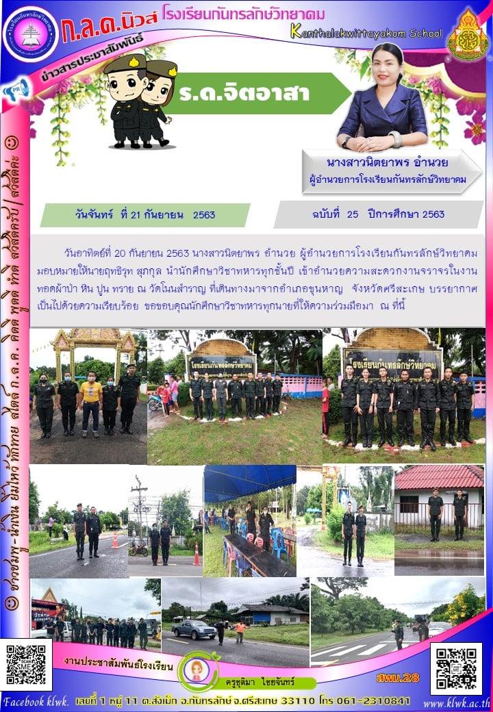 วันอาทิตย์ที่ 20 กันยายน 2563 นางสาวนิตยาพร อำนวย ผู้อำนวยการโรงเรียนกันทรลักษ์วิทยาคม มอบหมายให้นายฤทธิรุท สุภกุล นำนักศึกษาวิชาทหารทุกชั้นปี เข้าอำนวยความสะดวกงานจราจรในงานทอดผ้าป่า หิน ปูน ทราย ณ วัดโนนสำราญ ที่เดินทางมาจากอำเภอขุนหาญ จังหวัดศรีสะเกษ บรรยากาศเป็นไปด้วยความเรียบร้อย ขอขอบคุณนักศึกษาวิชาทหารทุกนายที่ให้ความร่วมมือมา ณ ที่นี้ |