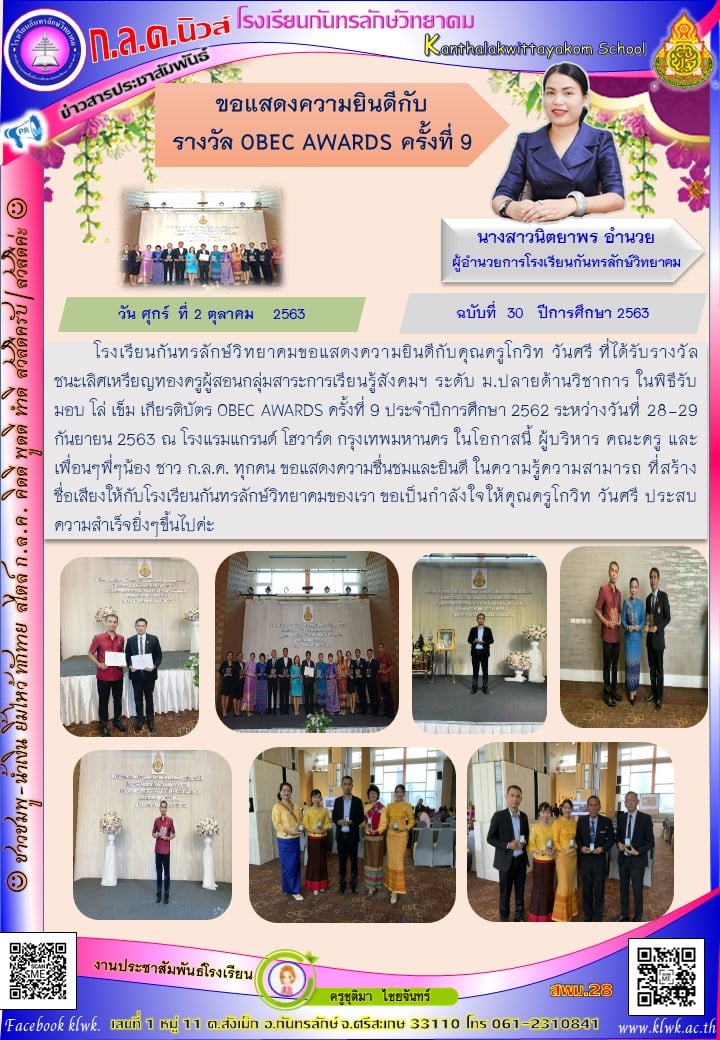 โรงเรียนกันทรลักษ์วิทยาคมขอแสดงความยินดีกับคุณครูโกวิท วันศรี ที่ได้รับรางวัลชนะเลิศเหรียญทองครูผู้สอนกลุ่มสาระการเรียนรู้สังคมฯ ระดับ ม.ปลายด้านวิชาการ ในพิธีรับมอบ โล่ เข็ม เกียรติบัตร OBEC AWARDS ครั้งที่ 9 ประจำปีการศึกษา 2562 ระหว่างวันที่ 28-29 กันยายน 2563 ณ โรงแรมแกรนด์ โฮวาร์ด กรุงเทพมหานคร ในโอกาสนี้ ผู้บริหาร คณะครู และเพื่อนๆพี่ๆน้อง ชาว ก.ล.ค. ทุกคน ขอแสดงความชื่นชมและยินดี ในความรู้ความสามารถ ที่สร้างชื่อเสียงให้กับโรงเรียนกันทรลักษ์วิทยาคมของเรา ขอเป็นกำลังใจให้คุณครูโกวิท วันศรี ประสบความสำเร็จยิ่งๆขึ้นไปค่ะ |