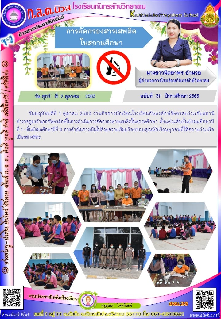 วันพฤหัสบดีที่ 1 ตุลาคม 2563 งานกิจการนักเรียนโรงเรียนกันทรลักษ์วิทยาคมร่วมกับสถานีตำรวจภูธรอำเภอกันทรลักษ์ในการดำเนินการคัดกรองสารเสพติดในสถานศึกษา ตั้งแต่ระดับชั้นมัธยมศึกษาปีที่ 1 –ชั้นมัธยมศึกษาปีที่ 6 การดำเนินการเป็นไปด้วยความเรียบร้อยขอบคุณนักเรียนทุกคนที่ให้ความร่วมมือเป็นอย่างดีค่ะ |