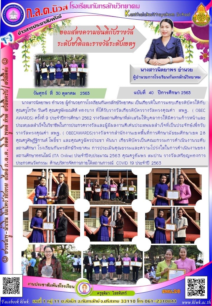 นางสาวนิตยาพร อำนวย ผู้อำนวยการโรงเรียนกันทรลักษ์วิทยาคม เป็นเกียรติในการมอบเกียรติบัตรให้กับ คุณครูโกวิท วันศรี คุณครูพัทธเนติห์ ทองบาง ที่ได้รับรางวัลเกียรติบัตรรางวัลทรงคุณค่า สพฐ. ( OBEC AWARDS) ครั้งที่ 9 ประจำปีการศึกษา 2562 รางวัลสถานศึกษาที่ส่งเสริมให้บุคลากรให้มีความก้าวหน้าและประสบผลสำเร็จในวิชาชีพในการประกวดรางวัลและผู้มีผลงานดีเด่นประสพผลสำเร็จที่เป็นประจักษ์เพื่อรับรางวัลทรงคุณค่า สพฐ. ( OBECAWARDS)รางวัลจากสำนักงานเขตพื้นที่การศึกษามัธยมศึกษาเขต 28 คุณครูศิษฏ์ฐิกานต์ โพธิ์ชา และคุณครูฉัตรประชา ทันนา เกียรติบัตรเป็นคณะกรรมการดำเนินงานระดับสถานศึกษา โรงเรียนกันทรลักษ์วิทยาคม การประเมินคุณธรรมและความโปร่งใสในการดำเนินงานของสถานศึกษาออนไลน์ (ITA Online) ประจำปีงบประมาณ 2563 คุณครูอัมพร สมปาน รางวัลเหรียญทองการประกวดนวัตกรรม ด้านบริหารจัดการภายใต้สถานการณ์ COVID 19 ประจำปี 2563 |