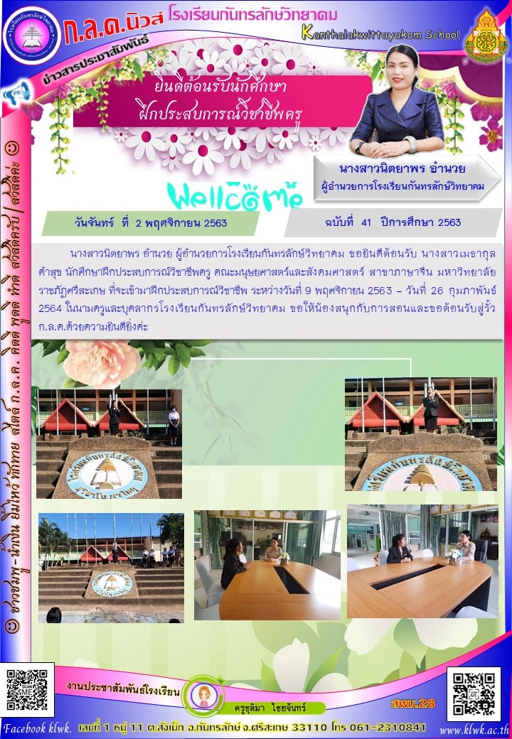 นางสาวนิตยาพร อำนวย ผู้อำนวยการโรงเรียนกันทรลักษ์วิทยาคม ขอยินดีต้อนรับ นางสาวเมธากุล คำสุข นักศึกษาฝึกประสบการณ์วิชาชีพครู คณะมนุษยศาสตร์และสังคมศาสตร์ สาขาภาษาจีน มหาวิทยาลัยราชภัฏศรีสะเกษ ที่จะเข้ามาฝึกประสบการณ์วิชาชีพ ระหว่างวันที่ 9 พฤศจิกายน 2563 – วันที่ 26 กุมภาพันธ์ 2564 ในนามครูและบุคลากรโรงเรียนกันทรลักษ์วิทยาคม ขอให้น้องสนุกกับการสอนและขอต้อนรับสู่รั้ว ก.ล.ค.ด้วยความยินดียิ่งค่ะ |