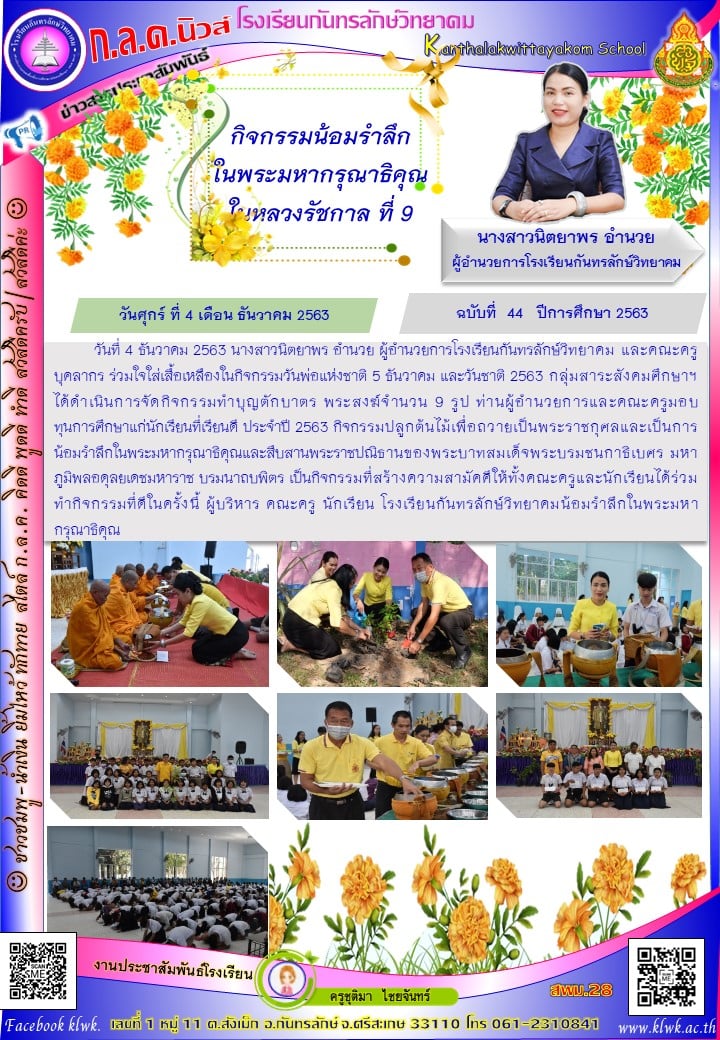 ผู้อำนวยการโรงเรียนกันทรลักษ์วิทยาคม และคณะครูบุคลากร ร่วมใจใส่เสื้อหลืองในกิจกรรมวันพ่อแห่งชาติ 5 ธันวาคม และวันชาติ 2563 กลุ่มสาระสังคมศึกษาฯ ได้ดำเนินการจัดกิจกรรมทำบุญตักบาตร พระสงฆ์จำนวน 9 รูป ท่านผู้อำนวยการและคณะครูมอบทุนการศึกษาแก่นักรียนที่เรียนดี ประจำปี 2563 กิจกรรมปลูกต้นไม้เพื่อถวายป็นพระราชกุศลและเป็นการน้อมรำลึกในพระมหากรุณาธิคุณและสืบสานพระราชปณิธานของพระบาทสมเด็จพระบรมชนกาธิเบศร มหาภูมิพลดุลยดชหาราช บรมนาถบพิต เป็นกิจกรรมที่สร้างความสามัคคีให้ทั้งคณะครูและนักเรียนได้ร่วมทำกิจกรรมที่ดีในครั้งนี้ ผู้บริหาร คณะครู นักเรียน โรงเรียนกันทรลักษ์วิทยาคม น้อมรำลึกในพระมหากรุณาธิคุณ |