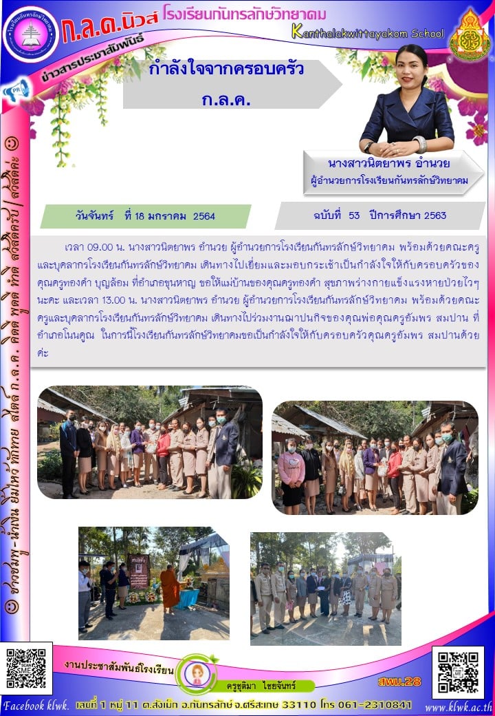 เวลา 09.00 น. นางสาวนิตยาพร อำนวย ผู้อำนวยการโรงเรียนกันทรลักษ์วิทยาคม พร้อมด้วยคณะครูและบุคลากรโรงเรียนกันทรลักษ์วิทยาคม เดินทางไปเยี่ยมและมอบกระเช้าเป็นกำลังใจให้กับครอบครัวของคุณครูทองคำ บุญล้อม ที่อำเภอขุนหาญ ขอให้แม่บ้านของคุณครูทองคำ สุขภาพร่างกายแข็งแรงหายป่วยไวๆนะคะ และเวลา 13.00 น. นางสาวนิตยาพร อำนวย ผู้อำนวยการโรงเรียนกันทรลักษ์วิทยาคม พร้อมด้วยคณะครูและบุคลากรโรงเรียนกันทรลักษ์วิทยาคม เดินทางไปร่วมงานฌาปนกิจของคุณพ่อคุณครูอัมพร สมปาน ที่อำเภอโนนคูณ ในการนี้โรงเรียนกันทรลักษ์วิทยาคมขอเป็นกำลังใจให้กับครอบครัวคุณครูอัมพร สมปานด้วยค่ะ |