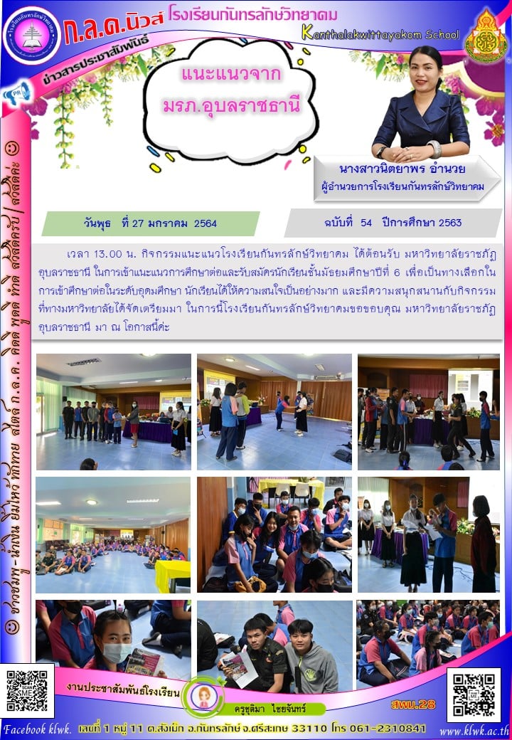 เวลา 13.00 น. กิจกรรมแนะแนวโรงเรียนกันทรลักษ์วิทยาคม ได้ต้อนรับ มหาวิทยาลัยราชภัฏอุบลราชธานี ในการเข้าแนะแนวการศึกษาต่อและรับสมัครนักเรียนชั้นมัธยมศึกษาปีที่ 6 เพื่อเป็นทางเลือกในการเข้าศึกษาต่อในระดับอุดมศึกษา นักเรียนได้ให้ความสนใจเป็นอย่างมาก และมีความสนุกสนานกับกิจกรรมที่ทางมหาวิทยาลัยได้จัดเตรียมมา ในการนี้โรงเรียนกันทรลักษ์วิทยาคมขอขอบคุณ มหาวิทยาลัยราชภัฏอุบลราชธานี มา ณ โอกาสนี้ค่ะ |