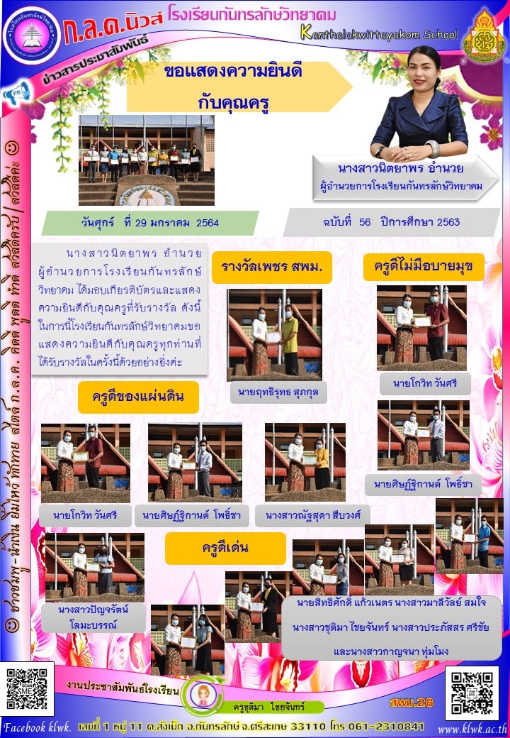 นางสาวนิตยาพร อำนวย ผู้อำนวยการโรงเรียนกันทรลักษ์วิทยาคม ได้มอบเกียรติบัตรและแสดงความยินดีกับคุณครูที่รับรางวัล ดังนี้ รางวัลเพชร สพม. คุณครูฤทธิรุทธ สุภกุล ,ครูดีเด่นเนื่องในวันครู 16 มกราคม 2564 คุณครูสิทธิศักดิ์ แก้วเนตร คุณครูมาลีวัลย์ สมใจ คุณครูชุติมา ไชยจันทร์ คุณครูประภัสสร ศรีชัยและคุณครูกาญจนา ทุ่มโมง, ครูดีของแผ่นดิน คุณครูโกวิท วันศรี คุณครูศิษฏ์ฐิกานต์ โพธิ์ชา คุณครูปัญจรัตน์ โลมะบรรณ์ และคุณครูณัฐสุดา สืบวงศ์ ,ครูดีไม่มีอบายมุข คุณครูโกวิท วันศรี และคุณครูศิษฏ์ฐิกานต์ โพธิ์ชา ในการนี้โรงเรียนกันทรลักษ์วิทยาคมขอแสดงความยินดีกับคุณครูทุกท่านที่ได้รับรางวัลในครั้งนี้ด้วยอย่างยิ่งค่ะ |