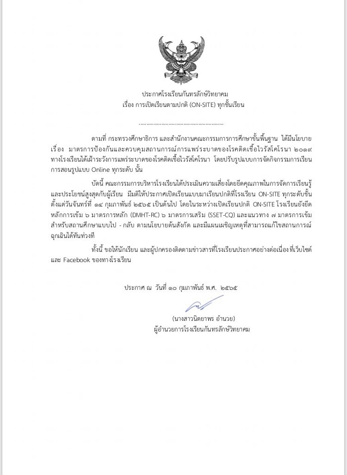 โรงเรียนกันทรลักษ์วิทยาคม จัดการเรียนการสอนรูปแบบปกติ(On Site) วันจันทร์ ที่ 14 กุมภาพันธ์ 2565 เป็นต้นไป ในทุกระดับชั้น