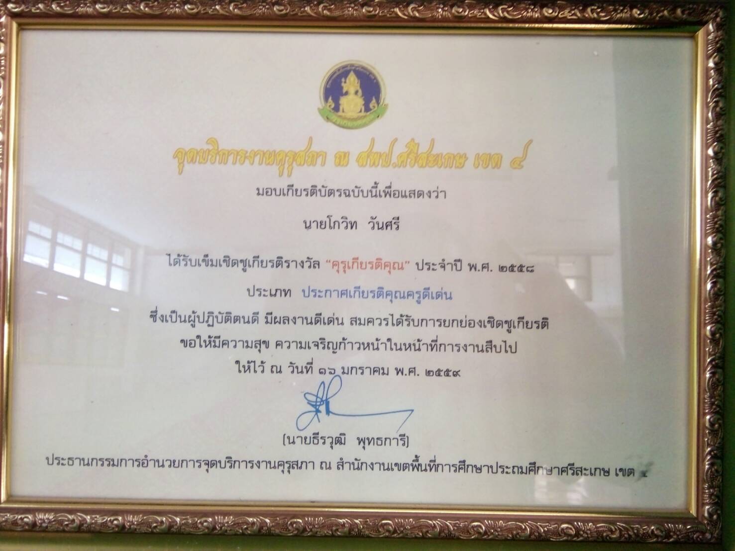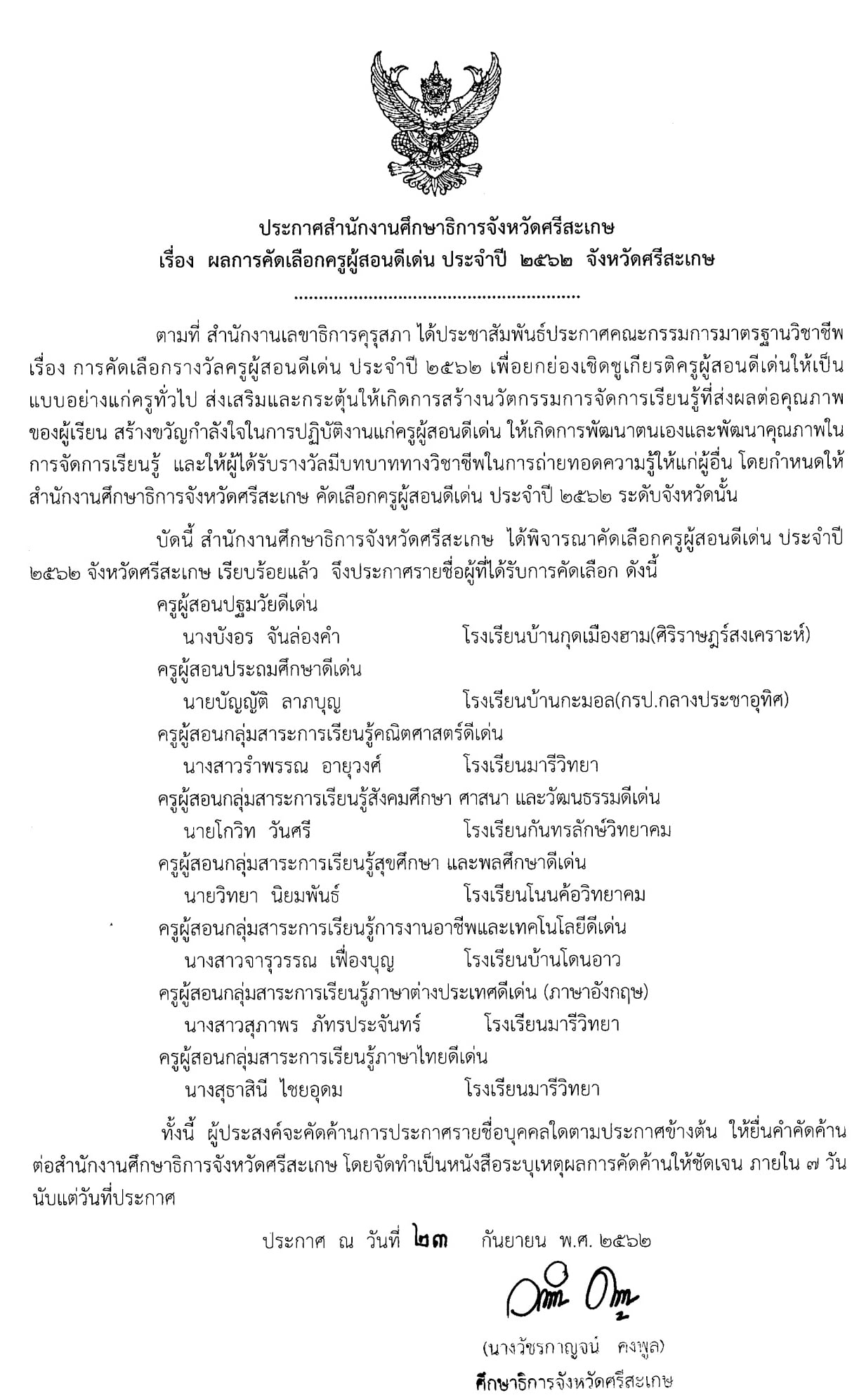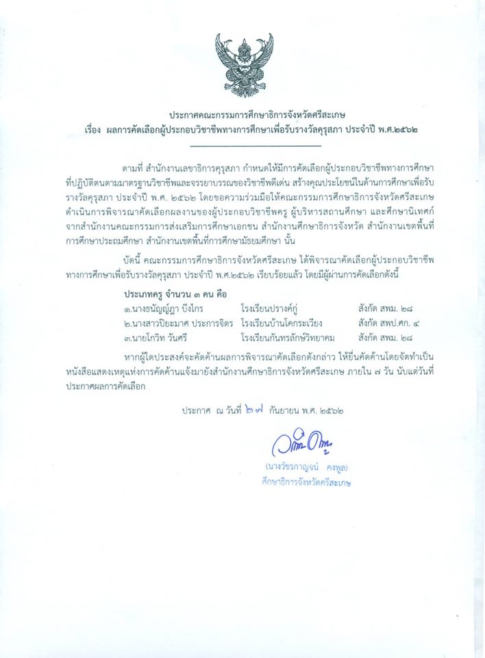 รางวัลครูผู้สอนดีเด่นคุรุสภาจังหวัดศรีสะเกษ. ปี 62