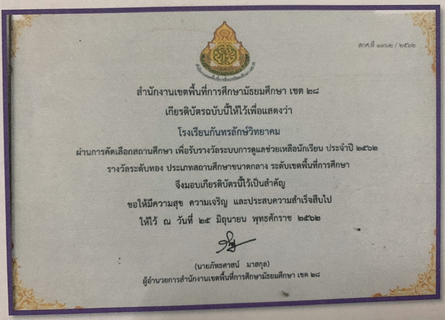รับรางวัลระบบดูแลช่วยเหลือนักเรียน มีผลการปฏิบัติงานเป็นเลิศ จนได้รับรางวัลเหรียญทองระดับเขตพื้นที่การศึกษา ปี 2562