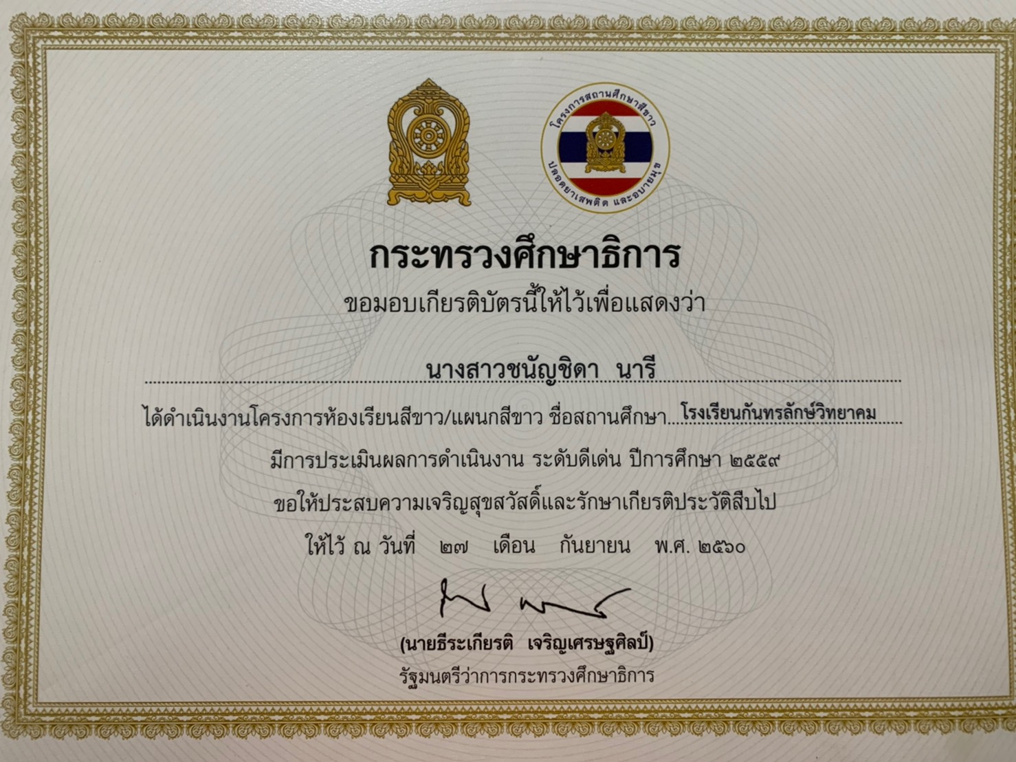 รับรางวัลการดำเนินงานโครงการห้องเรียนสีขาว/แผนกสีขาว มีผลการดำเนินงานระดับดีเด่น