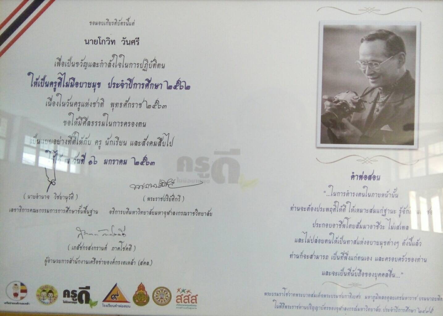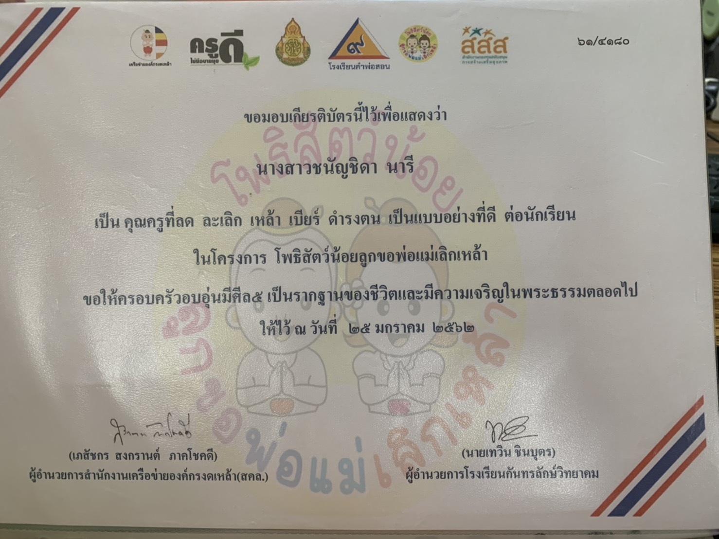 รับรางวัลเป็นครูที่ลด ละเลิก เหล้า เบียร์ ดำรงตน เป็นแบบอย่างที่ดีต่อนักเรียน
